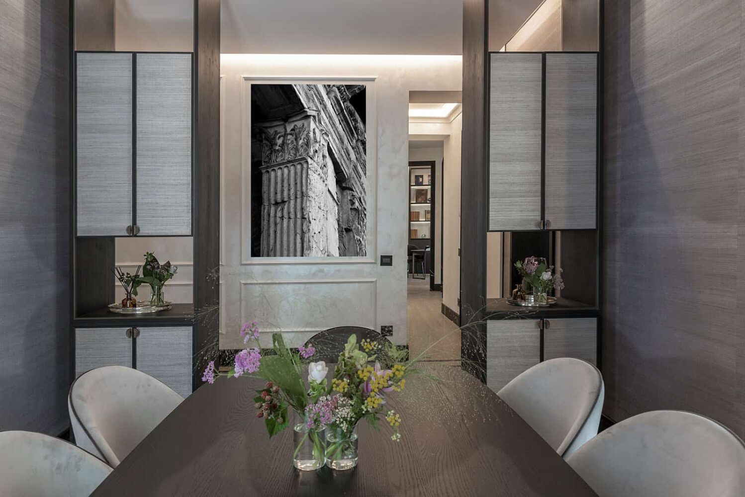 “I love to create spaces that convey passions and emotions with a sensual soul,” says architect Esposito, “In this project, every detail was meticulously studied to achieve an oriental ideal of perfection”. Light, warm materials like sandblasted oak parquet, and cold ones like iron and glass guide us through a refined path between modern art and classical references. The oak parquet, designed in both plug pattern and hexagons, was crafted by artisans. Iron and stone add natural textures, with simple lines counterpointed by rich decor and art pieces.